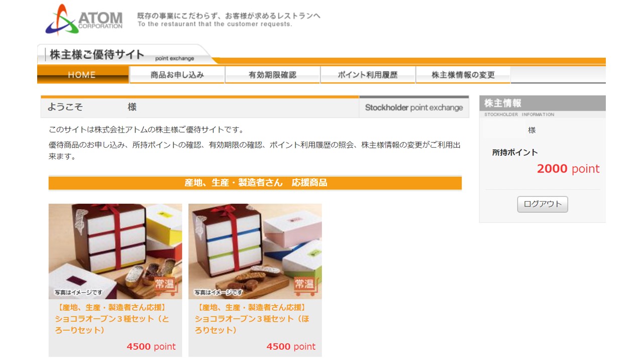 アトムは保有株数に応じて年2回(3月、9月)、お店で食事ができる優待ポイントがもらえます。