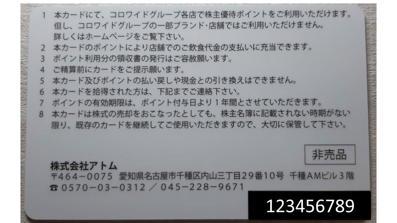 アトムの株主様ご優待カードは、株式を新規取得して初めての権利確定日をまたいだ場合に、初回に限り郵送されてきます。