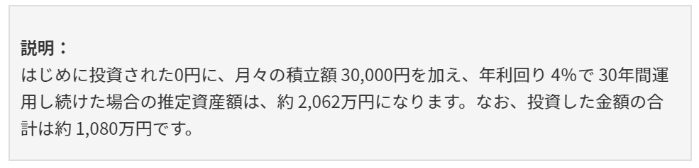 これまで毎月3万円貯金できていた分を、30歳からは平均利回り4%が見込める優良な投資信託を毎月3万円分買い付けることにしました。