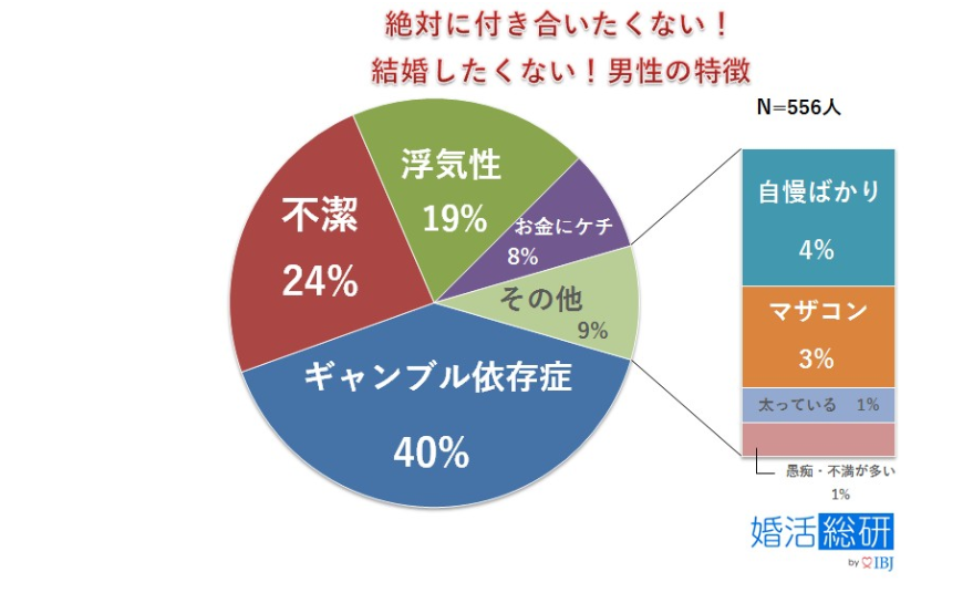 結婚を前提にしてしまうと、どうしても女性は出産や育児の問題もありますので、男性に対してある程度の年収を求めるのは理解できなくもないです。しかしいくら高年収であったとしても、以下の通りギャンブル依存症や不潔な男性は、女性から結婚相手として見向きもされないようです。