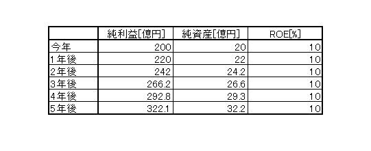 純利益を全額内部留保してROE10%を維持し続けるには、以下ように毎年純利益を増やし続けないといけません。