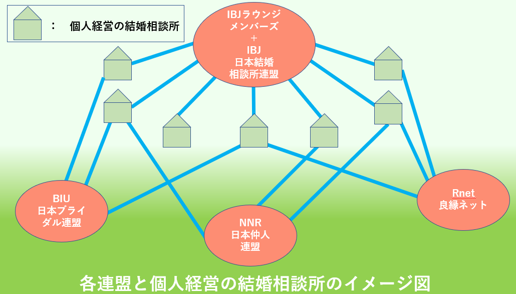 個人経営の結婚相談所はいずれか1つまたは複数の連盟に加盟することで、結婚相談所としてビジネスをすることが可能になり、婚活希望者はいずれかの結婚相談所に入会することによりそれらのシステムを利用して婚活をすることができるようになります。